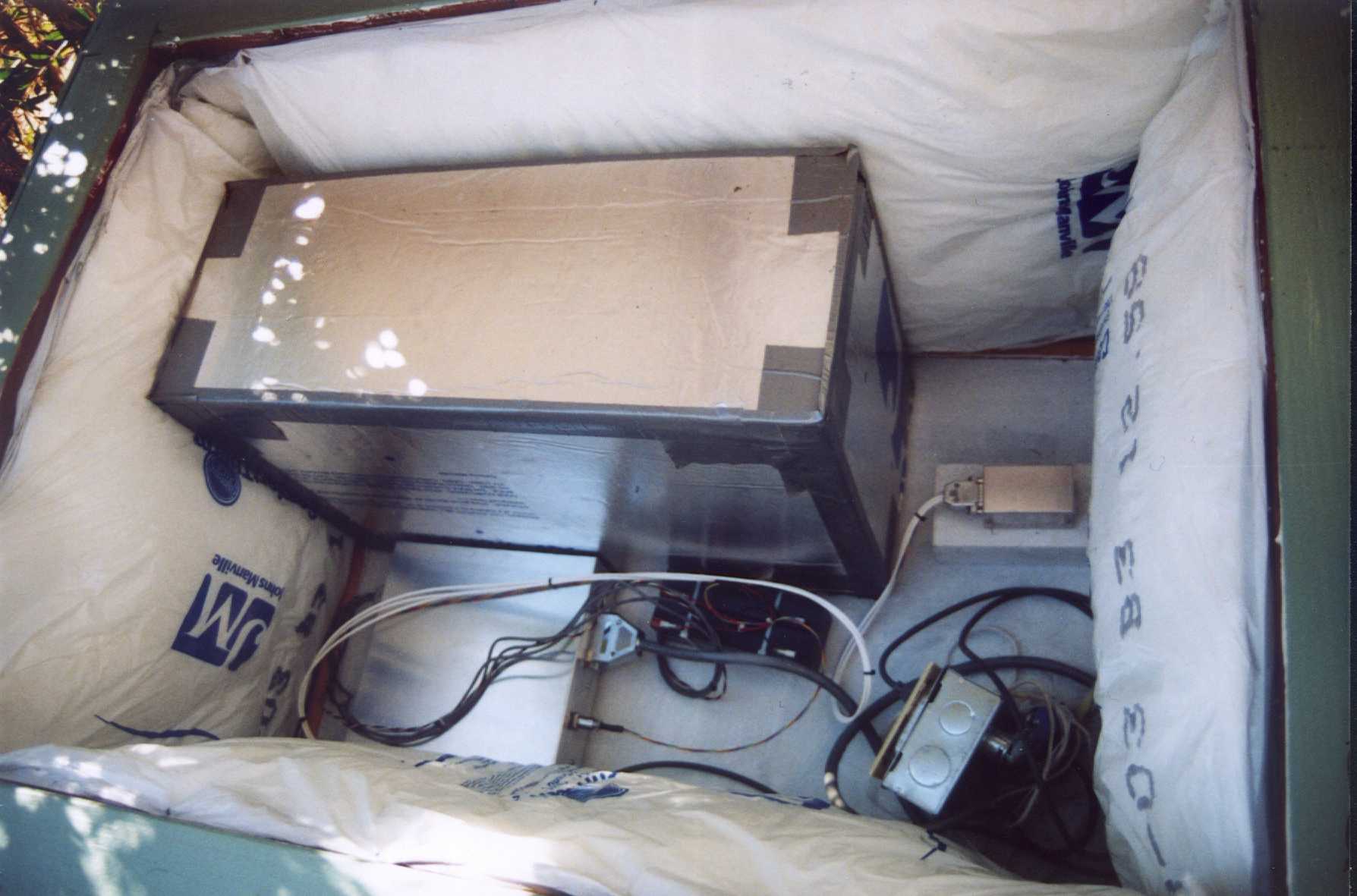 This picture shows the early phase of the construction of my "Seismic Vault". My soil is very heavy clay, hundreds of feet deep, so digging a deep hole to hit bedrock is pointless. My main concern was to maintain good coupling to the soil, but not to the housing. I also wanted to have the vault well insulated to keep the temperature as stable as possible. Despite my best efforts, I had to add a heater to keep the inside temperature within a few degrees. See Below. The slab is between 3 and four inches thick, 2 feet wide by 3 feet long, sitting on relatively undisturbed soil. In the near right corner (under the plastic bag) are the ends of some conduit. One carries power in, and the other is for the signals back to the lab. The slab is surrounded by 1 inch thick foam insulation board about 8 inches wide, set in a narrow trench around the slab. Separate from the slab are the four 4x4 posts, each about 3 feet long. They are joined by two rings of 2x4's, the bottom ones are treated. The top ones are recycled from a fence I tore down. The front pair are sitting in metal brackets, but are not permanently attached to the posts. |