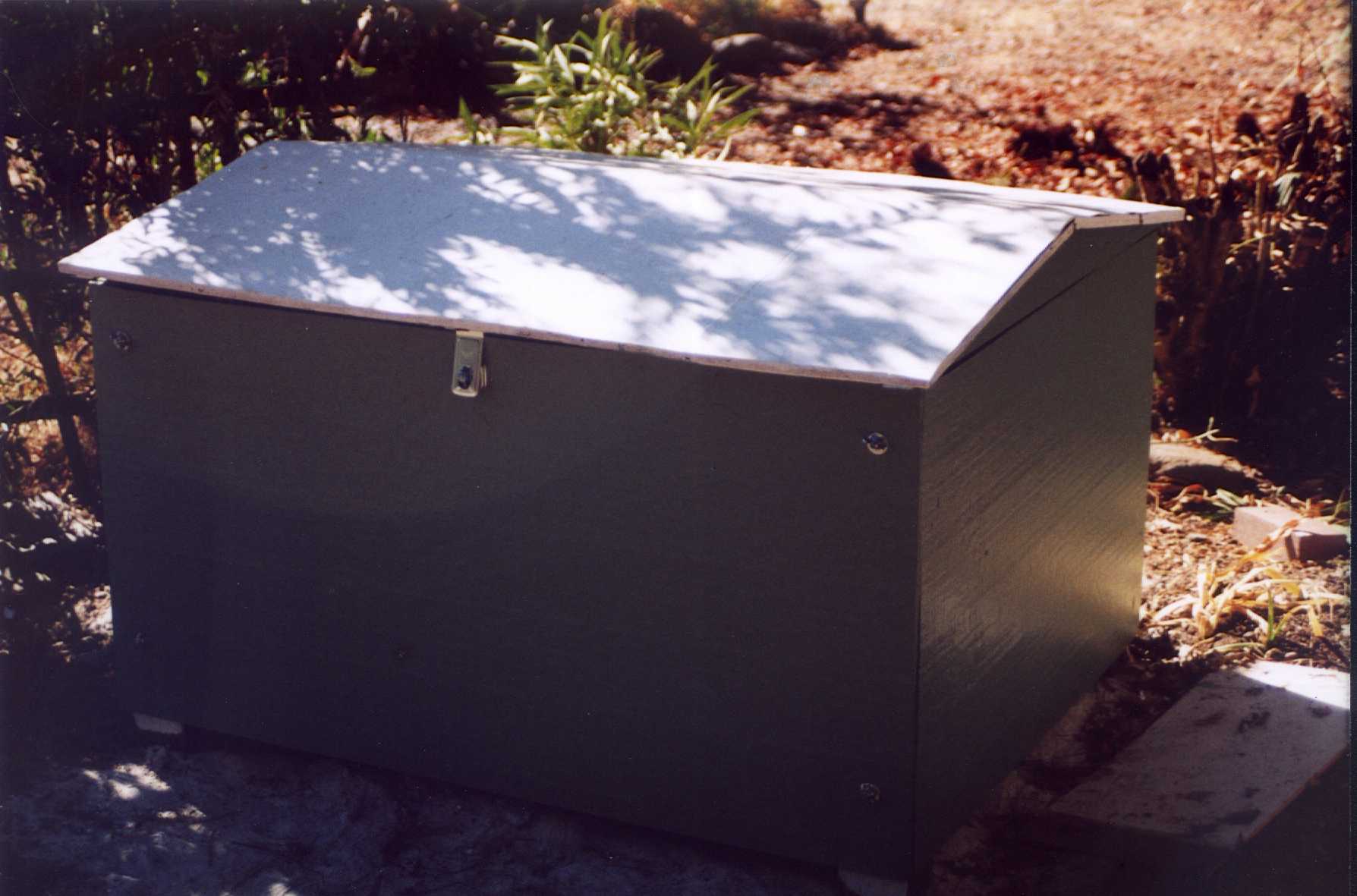 Finally, here's what the whole thing looks like with the lid closed and a nice coat of paint all over it. The lid is hinged for easy access, and it is insulated. It's really nice to be able to open the top and take off the front, especially when working on the Vbb, which has a very heavy base of concrete. |