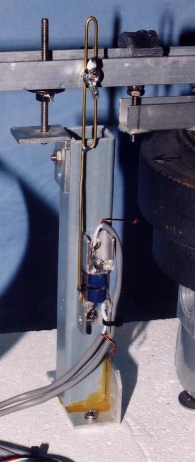 The sensor is the same VRDT type as described on Sean's pages. It was a little tricky to build and keep everything lined up, but it has been very reliable in use. The basic idea is that there are two coils mounted on "E" cores mounted face to face with a small gap between them. They are attached to the base. A pointer made of brass rod, with an attached bit of core material is attached to the boom and positioned so that with the boom in equilibrium, the pointer is centered in the gap. Turning this into a usable signal is up to the electronics.